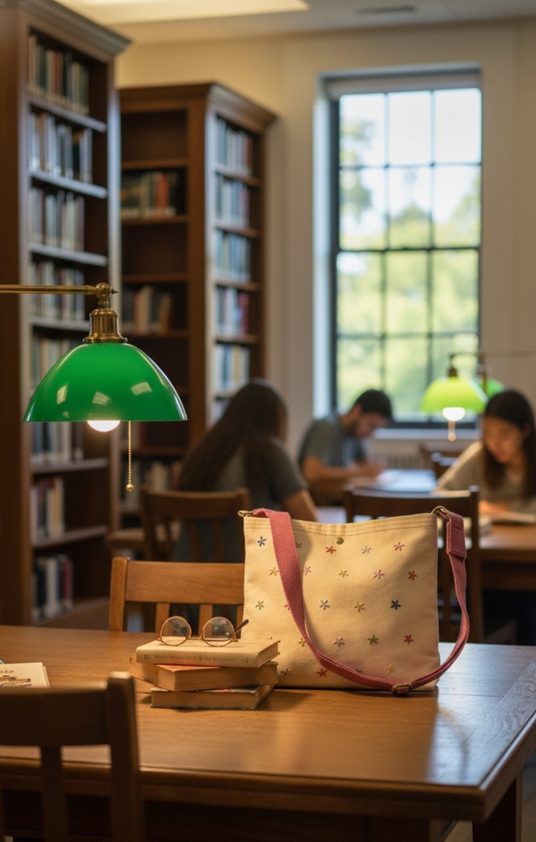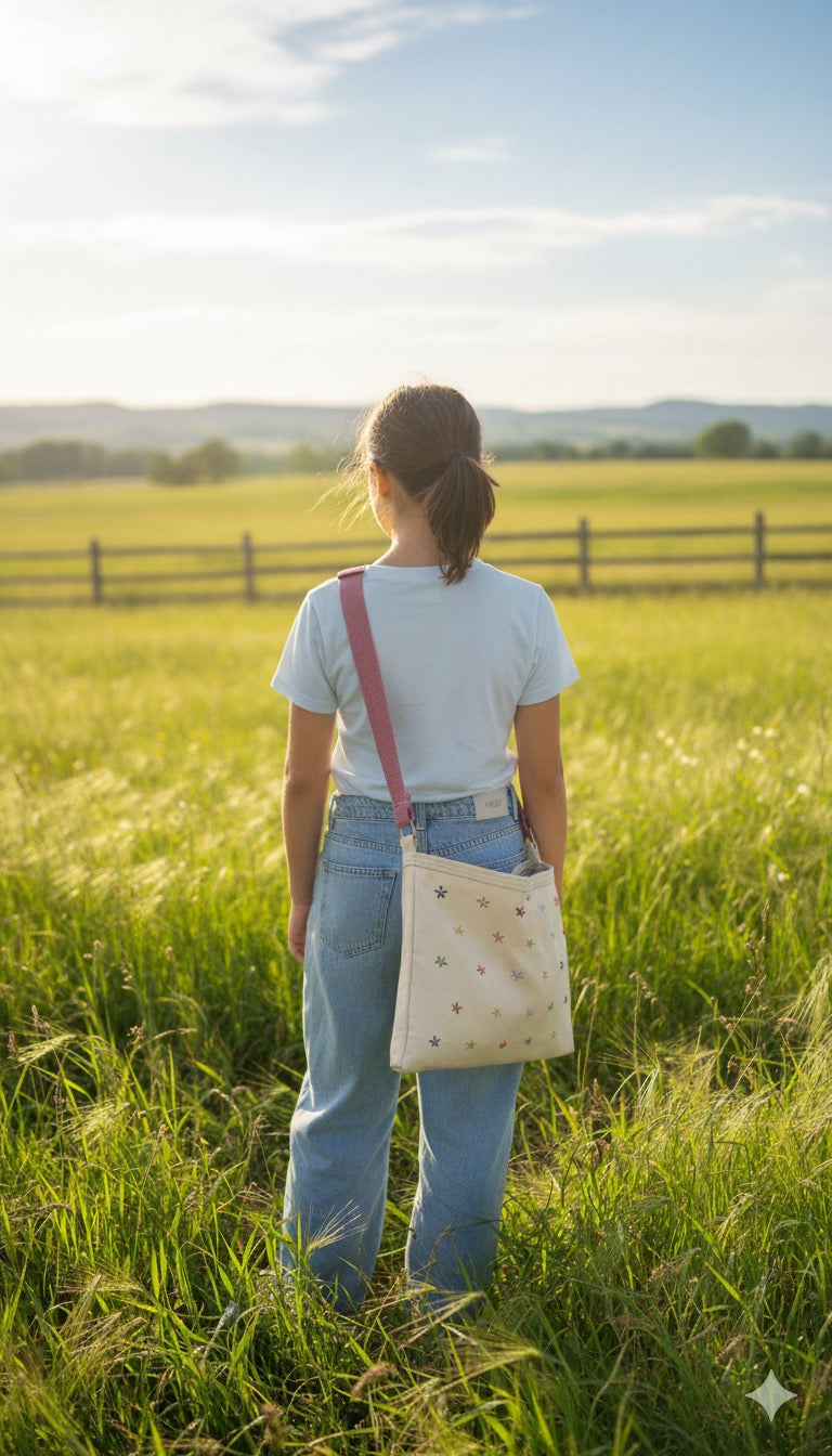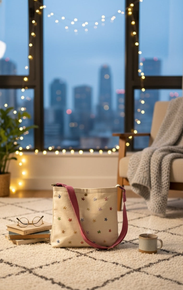This simple off white denim features scattered embroidered flowers along with a pink strap.