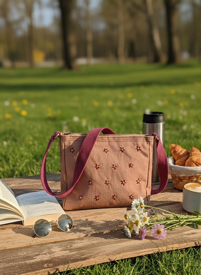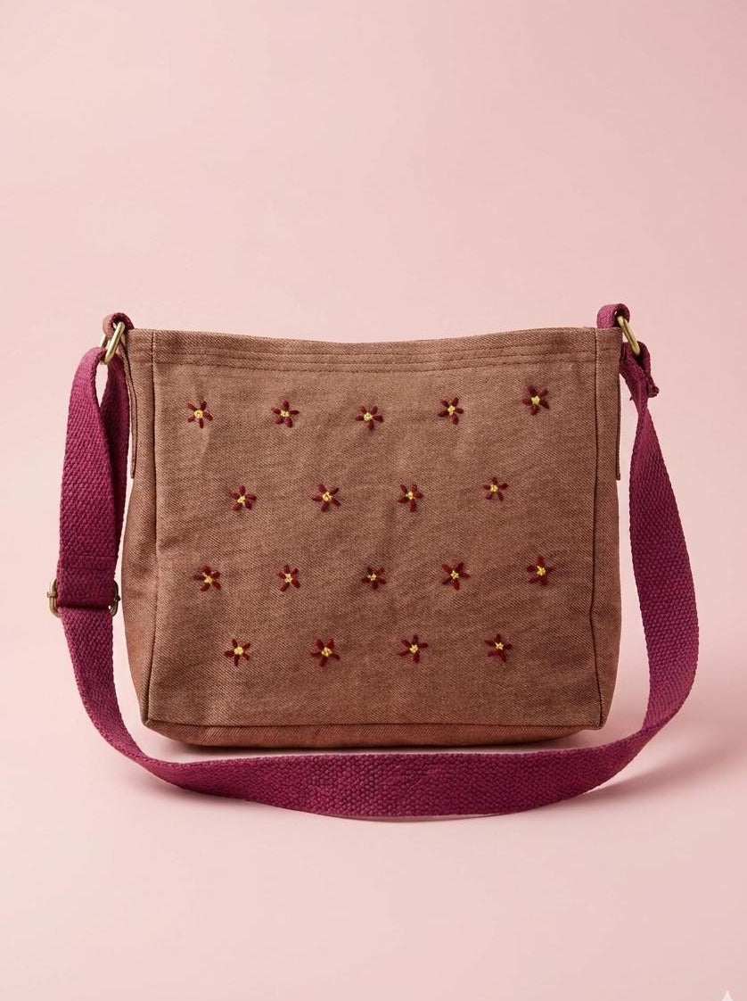 This simple off white denim features scattered embroidered flowers along with a pink strap.
