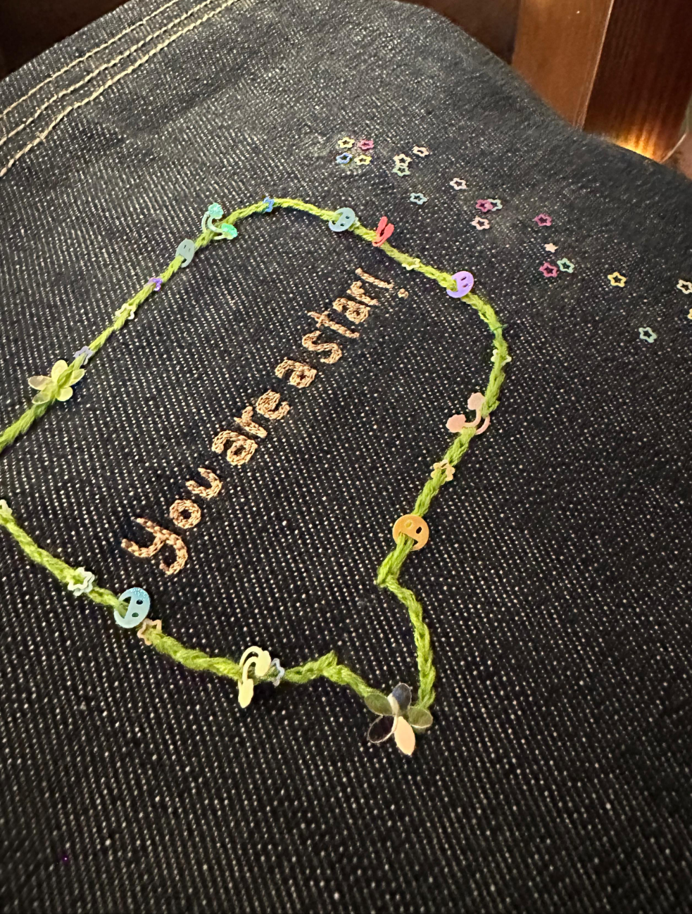This one-of-a-kind denim tote, features a lime green embroidered speech bubble with a personalized short text message. Embroidered with tiny colorful sequins and paired with a comfy brown leather strap, its perfect for daily errands, as a thoughtful gift! ✨