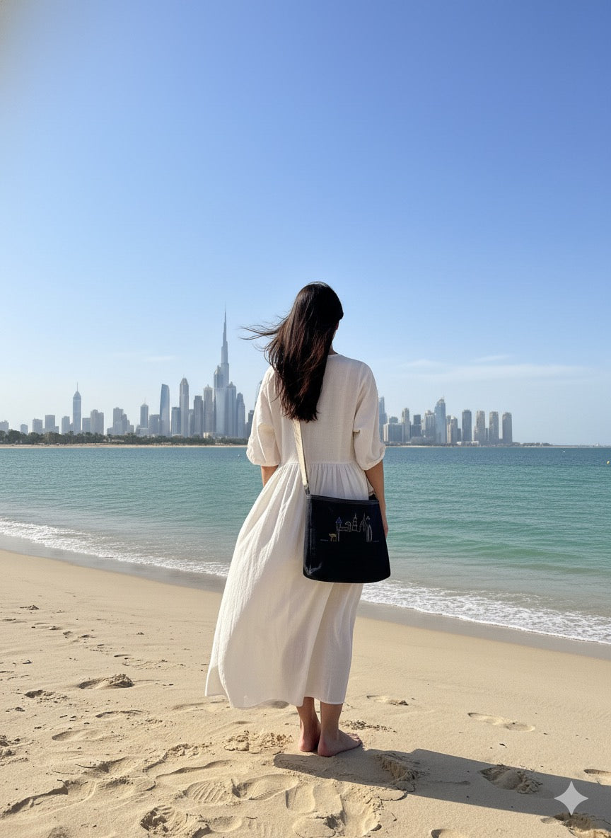 This dark grey denim tote features an embroidered cityscape design with outlined buildings and colorful beads to give it a touch of artistic embroidery. The overall look is casual with cream colored strap.