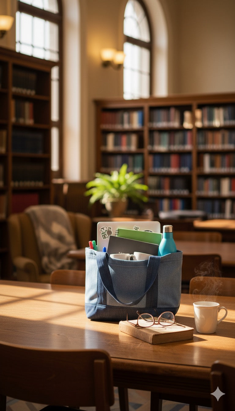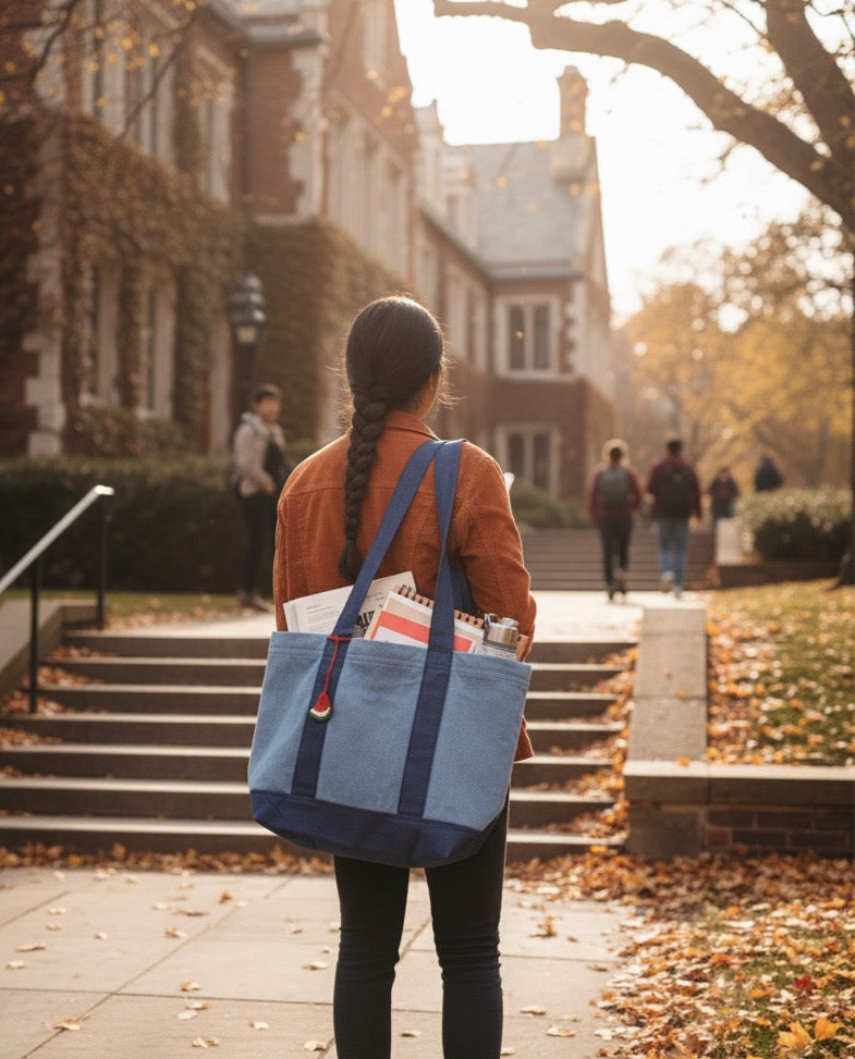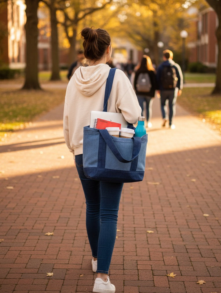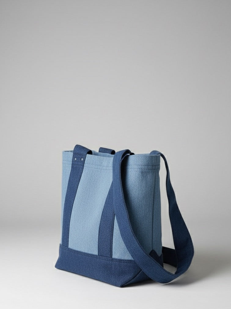 This stylish blue tote bag with a mix of light and dark blue hues is ideal for casual daily use. The bag has a sturdy design with dark blue accents and straps. It has one internal pocket.