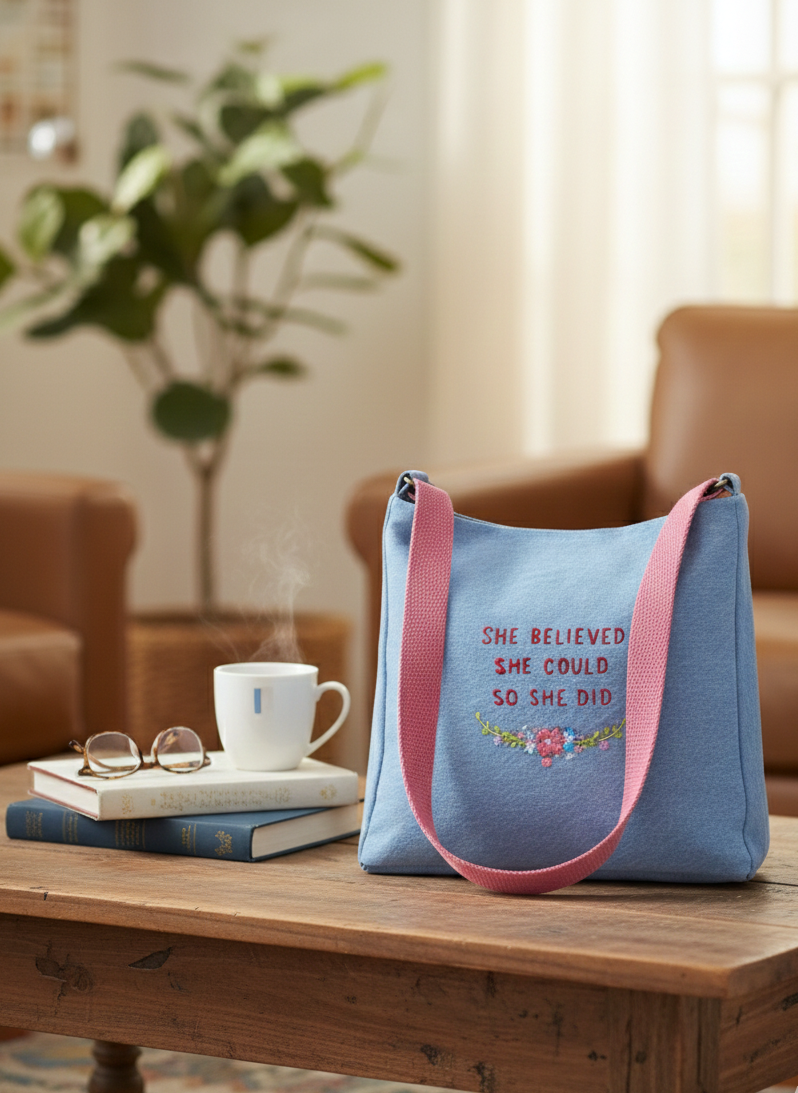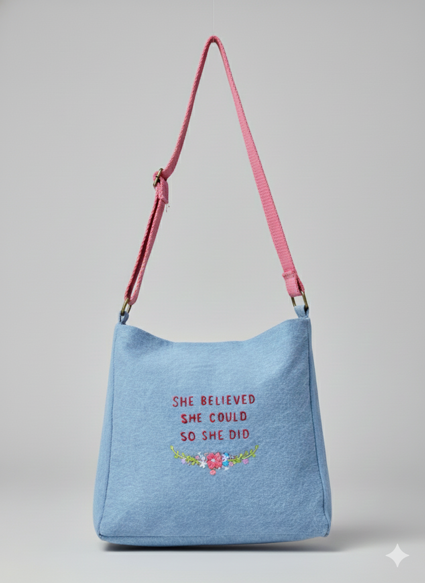 Featuring a pink strap and a beautiful embroidered design with the inspiring phrase 'SHE BELIEVED SHE COULD SO SHE DID', this bag is perfect for making a statement.