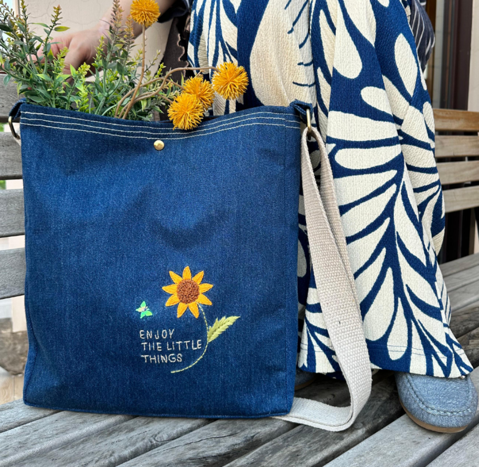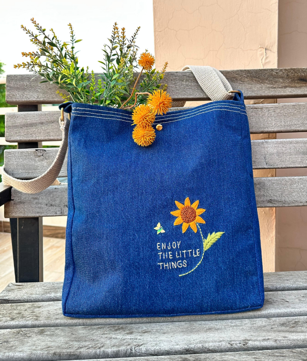 A stylish denim tote bag featuring an embroidered sunflower design paired with the uplifting phrase "ENJOY THE LITTLE THINGS",surrounded by a sparkly colorful butterfly.🌻